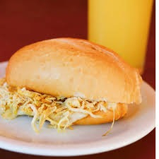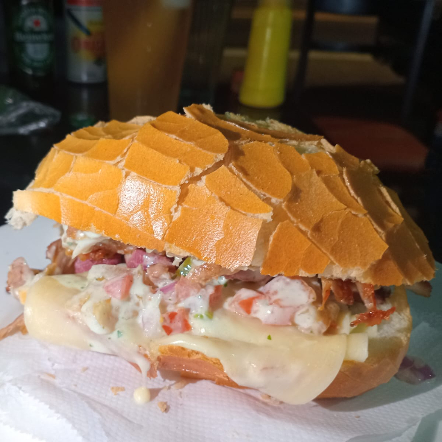 Pão francês recheado com 200g de pernil grelhado e fatiado, acompanha molho da casa e vinagrete