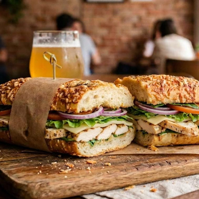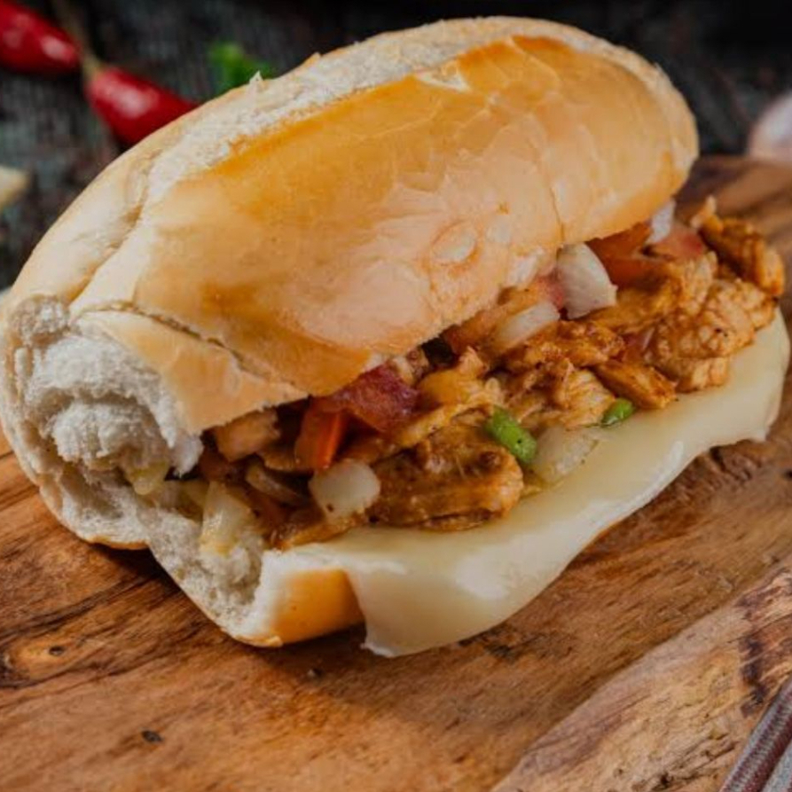 Baguete de parmesão, recheada com 300g de frango grelhado ao fogo e desfiada, com folhas de alface,cebola roxa e tomate em fatias, acompanha molho da casa e vinagrete.