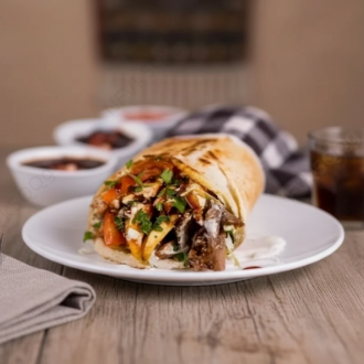 Experimente nosso shawarma uma iguaria árabe acompanha: pão sírio, 300g de fraldinha grelhada, pernil, frango, linguiça Toscana, pasta de alho e vinagrete.!