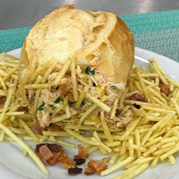 Baguete de parmesão, 300g de frango grelhado e fatiado, cheddar; bacon e catupiry; acompanha molho casa e vinagrete
