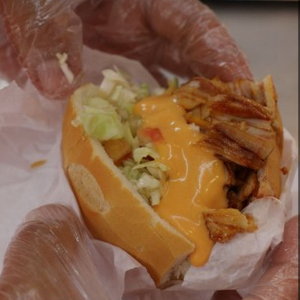 Pão francês, 180g de frango grelhado ao forno cortada em fatias suculentas e crocantes, bacon em fatias acompanha molho de alho, cheddar e o nosso vinagrete caseiro esse e o nosso churrasco grego de frango com cheddar.