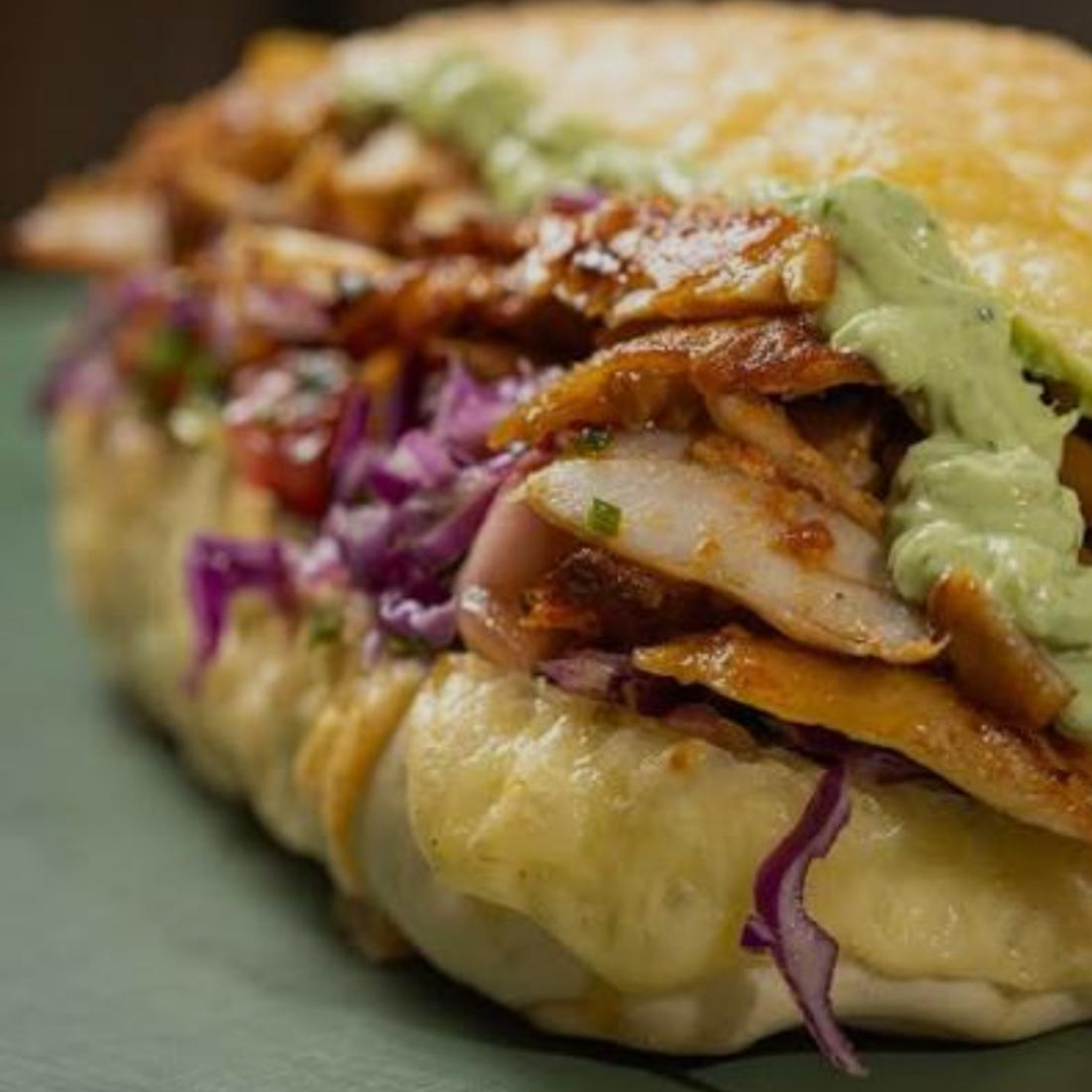 Baguete de parmesão, 300g de pernil grelhado ao fogo com cheddar, requeijão e bacon, acompanha molho da casa e vinagrete.