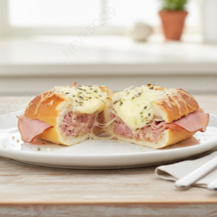 Pão francês, a dupla perfeita de pernil grelhado e mussarela fatiada, acompanha molho da casa vinagrete .