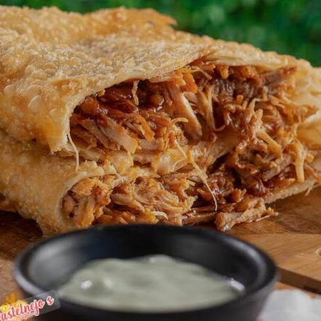 Massa de pastel, 200g de carne seca com queijo acompanha molho da casa e vinagrete.!