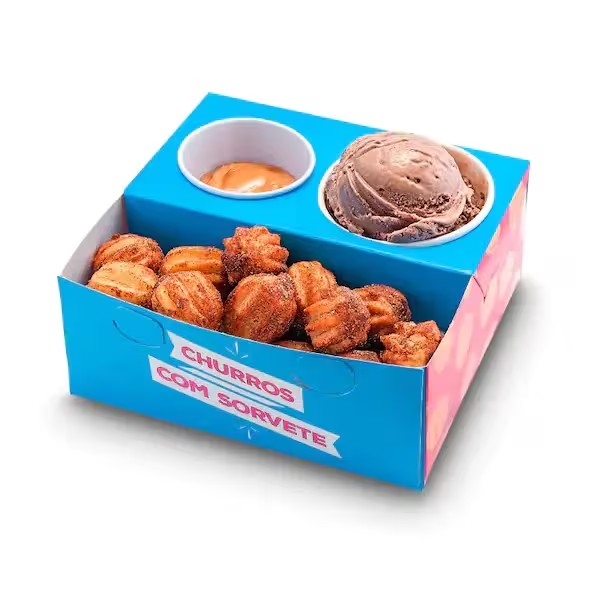 Peça e prepare em casa essa clássica combinação: 200g de churros congelados para fritar, 1 bola de sorvete de chocolate, uma generosa porção de doce de leite e canela em pó com açúcar para complementar.