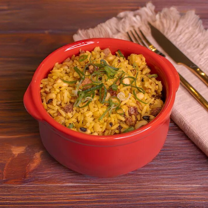 Ingredientes: Arroz parbolizado, queijo coalho, feijão fradinho, carne seca, bacon, linguiça calabresa, manteiga, cebola branca, bacon, pimenta biquinho, coentro, alho, sal refinado, óleo de soja, açafrão e louro