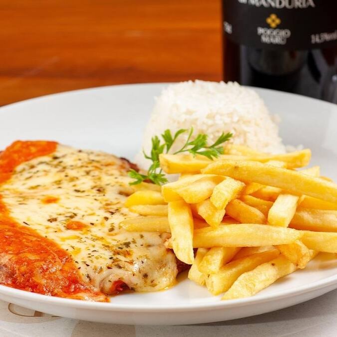 A nossa 'Parmegiana de Carne' é um prato extremamente suculento e saboroso. O mignon bovino, selecionado com o maior cuidado, é envolto em uma camada crocante e coberto com um delicioso molho de tomate caseiro e queijo parmesão gratinado, criando uma combinação irresistível. Acompanha um arroz branco soltinho, preparado no ponto certo, e batatas fritas crocantes e douradas, que conferem um toque especial ao prato. Uma verdadeira celebração de sabores e texturas que irá deixar seus sentidos maravilhados.
