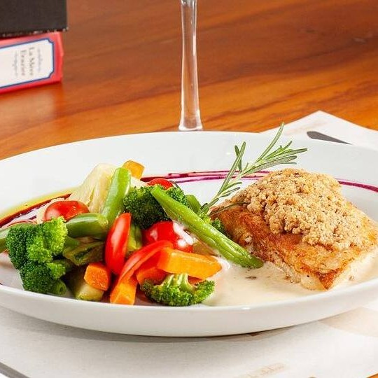 Aprecie a deliciosa Pescada com Crosta de Amêndoas, um prato da categoria Peixes. Este prato consiste em um suculento peixe branco, cuidadosamente grelhado até atingir o ponto ideal de sabor e textura. Sobre ele, uma crosta de amêndoas crocantes que adiciona um contraste de texturas irresistível. Acompanha uma variedade de legumes frescos, cozidos até ficarem macios, mantendo suas cores vibrantes. Tudo isso regado com um molho ao limone, cuja acidez equilibrada realça os sabores do peixe e das amêndoas, proporcionando uma experiência gastronômica única e inesquecível. Não perca a chance de saborear essa maravilha!