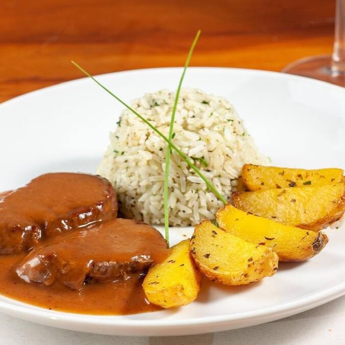 Apresentamos o delicioso 'Filé Ao Molho Poivre Vert', uma iguaria da nossa categoria 'Carnes e Aves'. Este prato é composto por um suculento escalope de mignon bovino, cuidadosamente preparado e regado com o nosso exclusivo molho rôti, feito com pimenta verde fresca. Para completar, o prato é generosamente guarnecido com batatas rústicas, trazendo um perfeito equilíbrio de sabores. Uma experiência gastronômica verdadeiramente inesquecível.