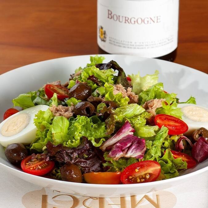 Descubra a autêntica salada Niçoise, uma requintada mistura Provençale. Delicie-se com a harmonia de frescas folhas verdes, suculentos tomatinhos cereja, ovos cozidos à perfeição, cebolinha verde picante, filetes de anchova intensamente saborosos, pimentões vermelhos crocantes, azeitonas pretas luxuosas e atum em conserva de qualidade superior. Finalizada com um toque de nosso molho especial, essa salada é a verdadeira personificação da cozinha francesa no seu melhor.