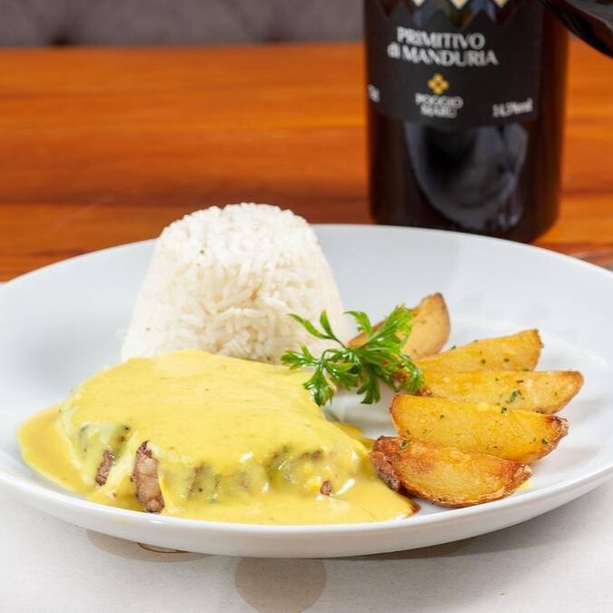 O 'Entrecote' é um prato requintado do nosso 'Menu Executivo - Prato + Sobremesa'. Desfrute de um tenro e saboroso entrecote bovino, cuidadosamente preparado e servido com um generoso molho à sua escolha: a pungência da mostarda ou a cremosidade do gorgonzola. Acompanha um arroz soltinho e perfeitamente temperado, além de deliciosas batatas rústicas, crocantes por fora e macias por dentro. Uma combinação irresistível que promete surpreender o seu paladar!