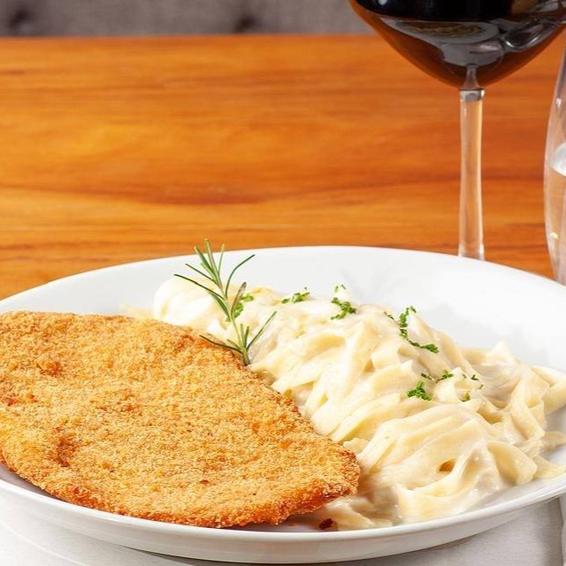 Milanesa De Frango Com Fettuccine Ao Molho Três Queijos.