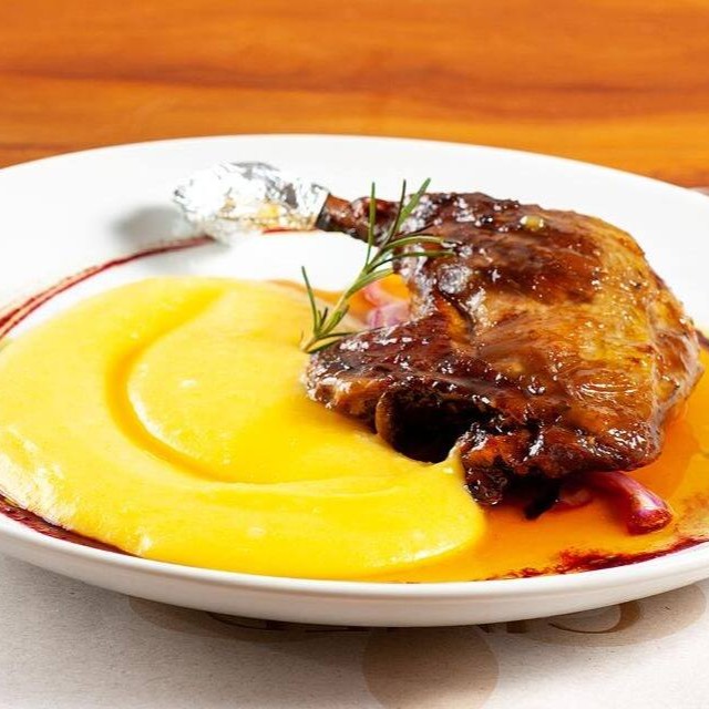 Delicioso 'Confit de Pato', uma especialidade da categoria 'Carnes e Aves'. Este prato sofisticado é preparado com uma suculenta coxa e sobrecoxa de pato, cuidadosamente confitada com ervas aromáticas que realçam seu sabor inigualável. Acompanha uma exuberante mousseline de mandioquinha, macia e cremosa, que proporciona um equilíbrio perfeito ao paladar. Além disso, é guarnecido com cebola roxa, trazendo um toque agridoce que complementa a experiência gastronômica. Uma verdadeira sinfonia de sabores que promete surpreender e encantar seu paladar.