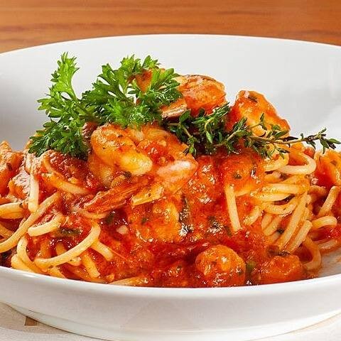 Espaguete ao molho sugo acompanhado de camarões.