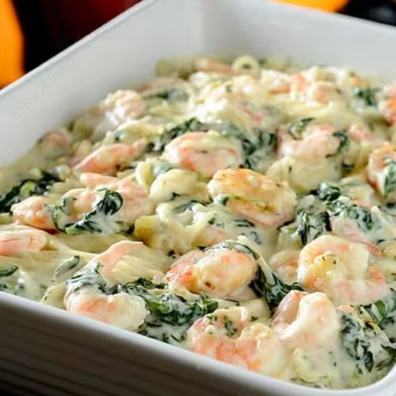 Camarões refogados com alho e cebola, flambados no vinho branco. Servido sobre espaguete ao molho bechamel e espinafre. Gratinado com queijo muçarela e parmesão.