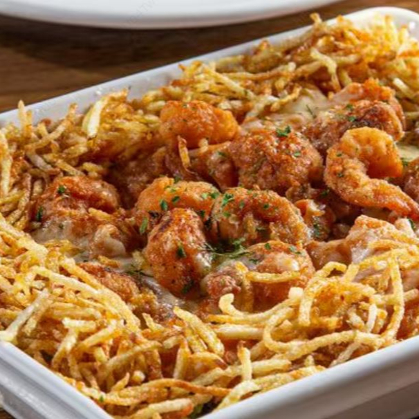 18 camarões empanados, recheados com queijo Catupiry, servido sobre cremoso arroz com camarão, ervilhas e presunto envolvido com molho branco. Gratinado com queijo mussarela. Acompanha batata palha.