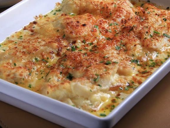 Arroz de Leite Coberto com Camarões Refogados Em Cheiro-Verde, Cebola, Alho, Tomate Fresco e Nata. O Prato e Gratinado e Acompanha Macaxeira Frita. Tamanho do Camarão Nesse Prato: 18g.