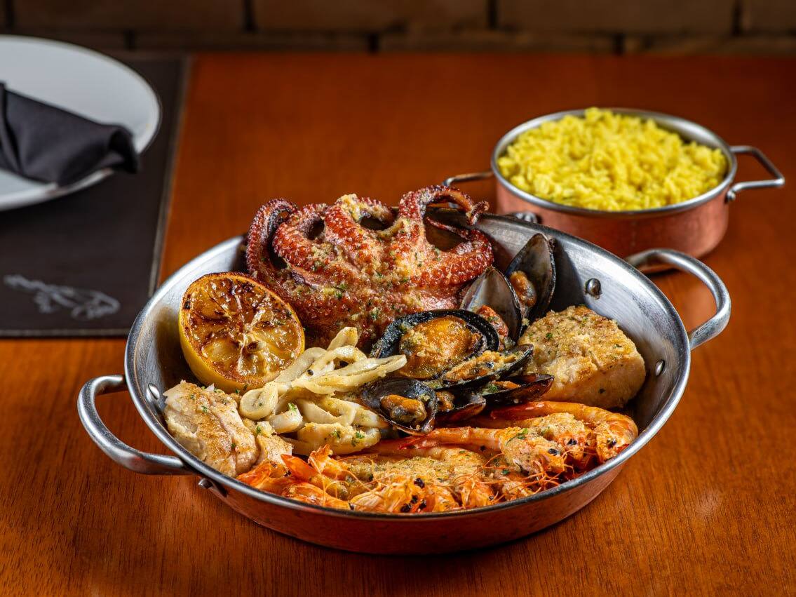 Arroz à grega (ervilhas, pimentões, passas, cenoura e presunto) coberto com de camarões à milanesa, molho caseiro de tomate fresco. Gratinado com queijo mussarela. Acompanha batata palha. (*) a quantidade de pessoas que cada prato serve é apenas uma