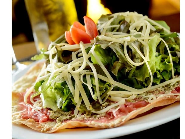 Arroz de leite com queijo coalho, coberto com carne de sol desfiada e refogada namanteiga da terra com cebola roxa, nata e coentro. Gratinada com queijo coalho.acompanha macaxeira frita.
