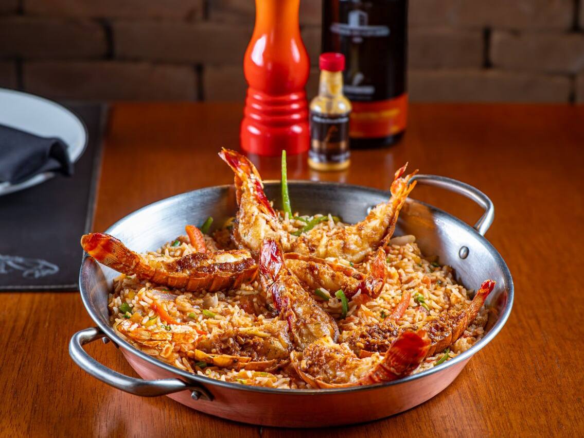Camarões grelhados, salpicados com alho frito e salsinha no azeite de oliva. Acompanha arroz com brócolis e legumes salteados na manteiga de ervas.