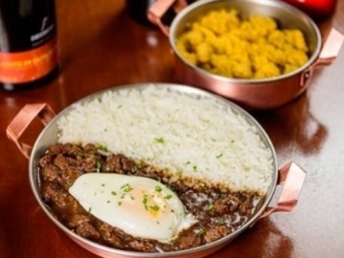 Filé Mignon Picado, Refogado com Cebola e Alho, Flambado e Acrescido de Vinho Tinto e Molhoroti Especial Da Casa. Coberto com Ovos Poche. Acompanha Farofa de Banana e Arroz Branco.