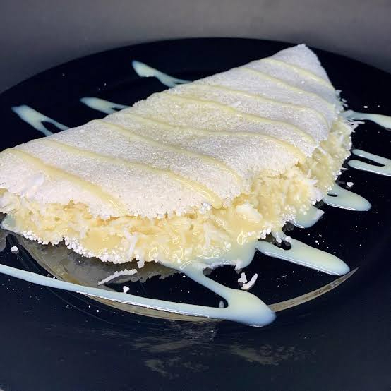 Tapioca de Coco com Leite Condensado Doce na medida certa! Tapioca recheada com coco ralado e coberta com leite condensado cremoso, trazendo aquele sabor caseiro e irresistível que derrete na boca. Perfeita para quem ama um toque tropical com muito carinho em cada mordida.