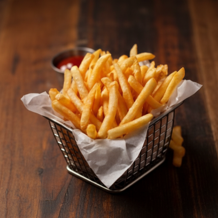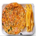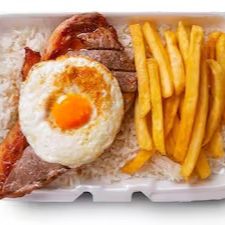 Arroz, feijão, salada, batata frita e dois ovos fritos.