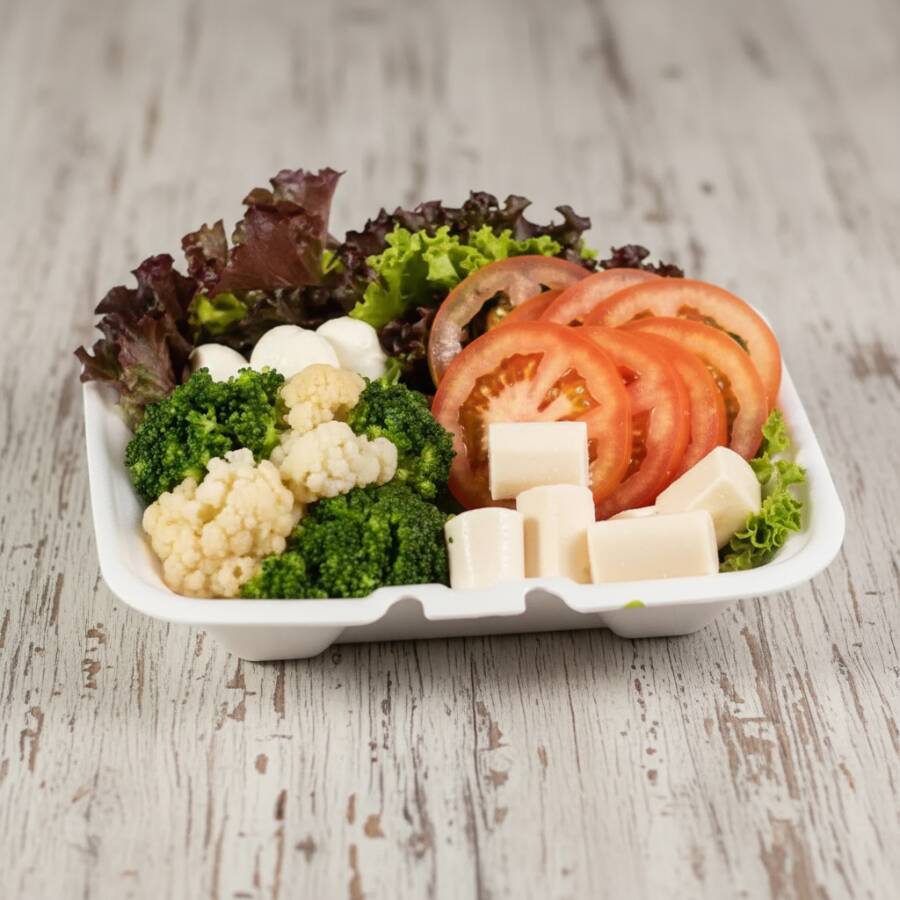 Variedade de legumes, variedade de salada e acompanha filé de frango grelhado.