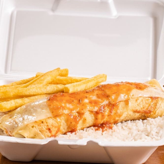 Acompanha arroz,feijão,1 panqueca ,salada e farofa e refri 200ml