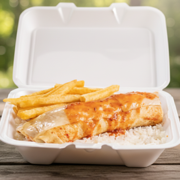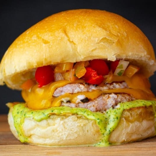 Pão tradicional, 2 burgers de 110g de calabresa, queijo prato, vinagrete e pimenta biquinho. Acompanha Batata E Refri 200ml