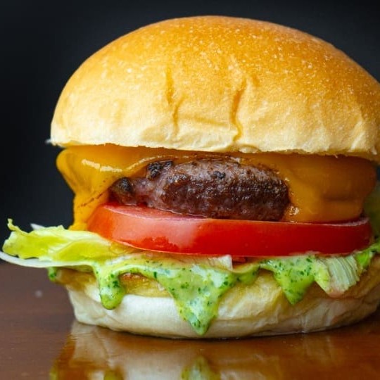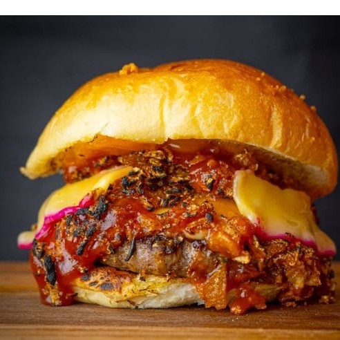Pão brioche, 140g de angus beef, queijo gouda, queijo prato e onion crispy