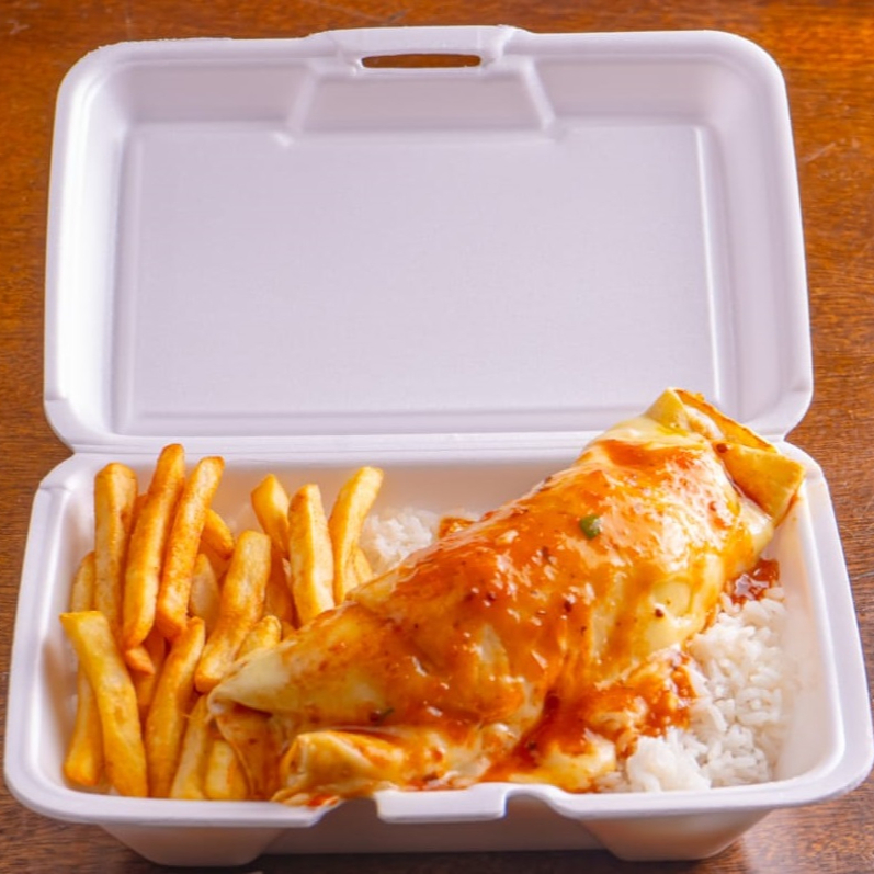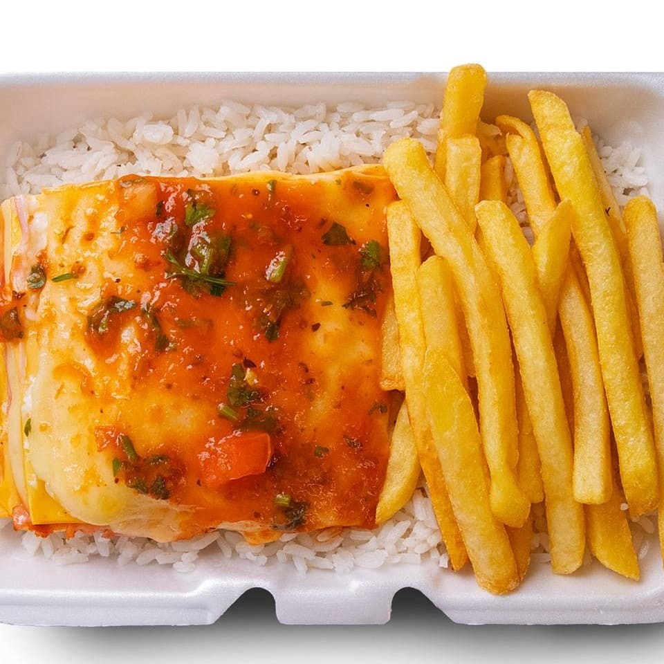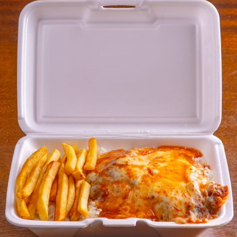 Arroz, feijão, bife à parmegiana, batata frita e farofa. Acompanha refrigerante 200ml.