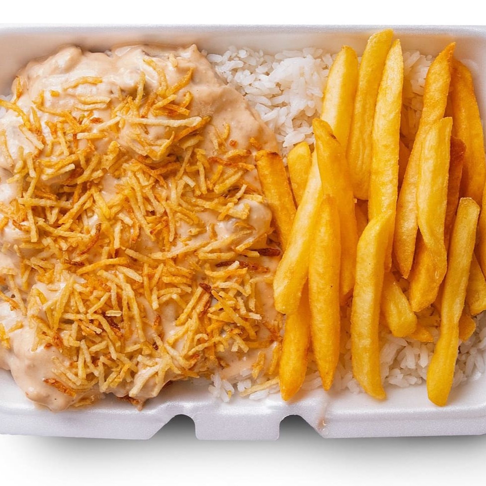 STROGONOFF DE CARNE (NÃO TEM CHAMPIGNON) ACOMPANHA: ARROZ, FEIJÃO, FRITAS, SALADA, FAROFA E REFRIGERANTE 200ML.