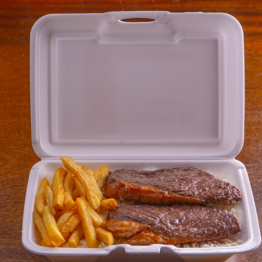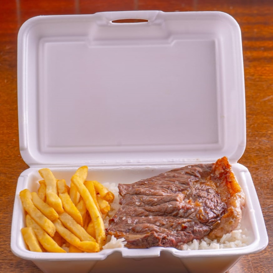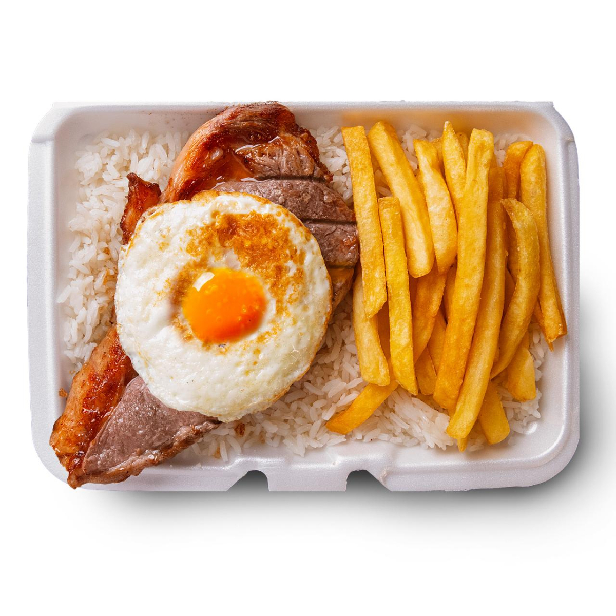 Arroz, feijão, contra filé, batata frita e farofa. Acompanha refrigerante 200ml.