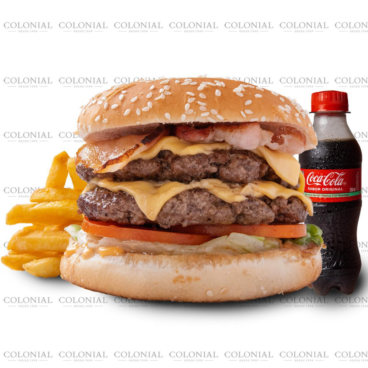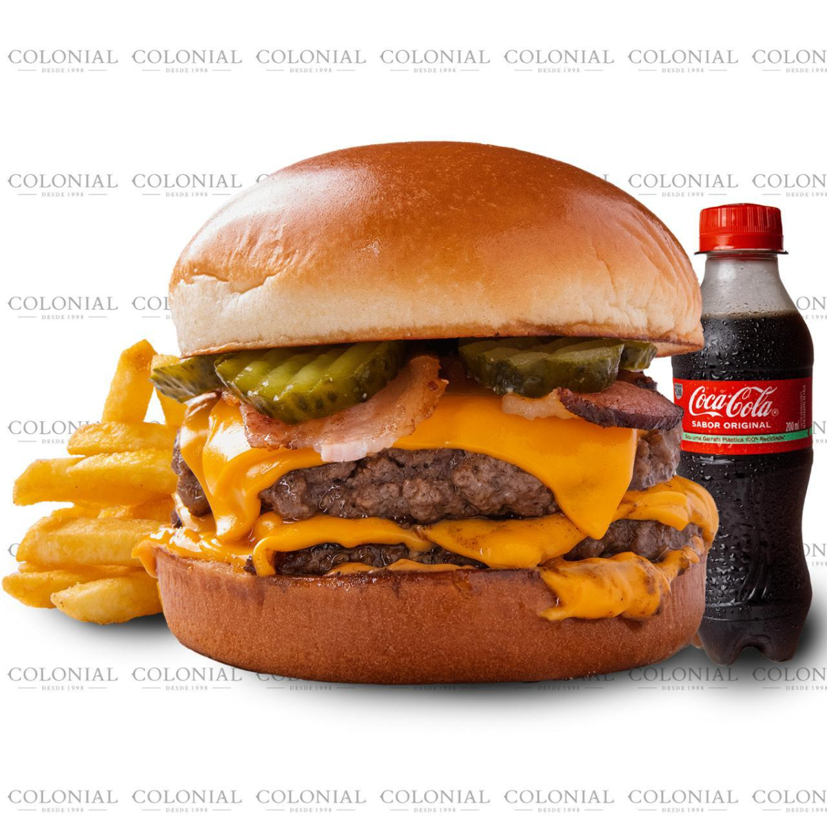 Pão brioche, 2 smash burger de 100g de angus beef, cheddar inglês, picles e bacon. Acompanha batata frita
