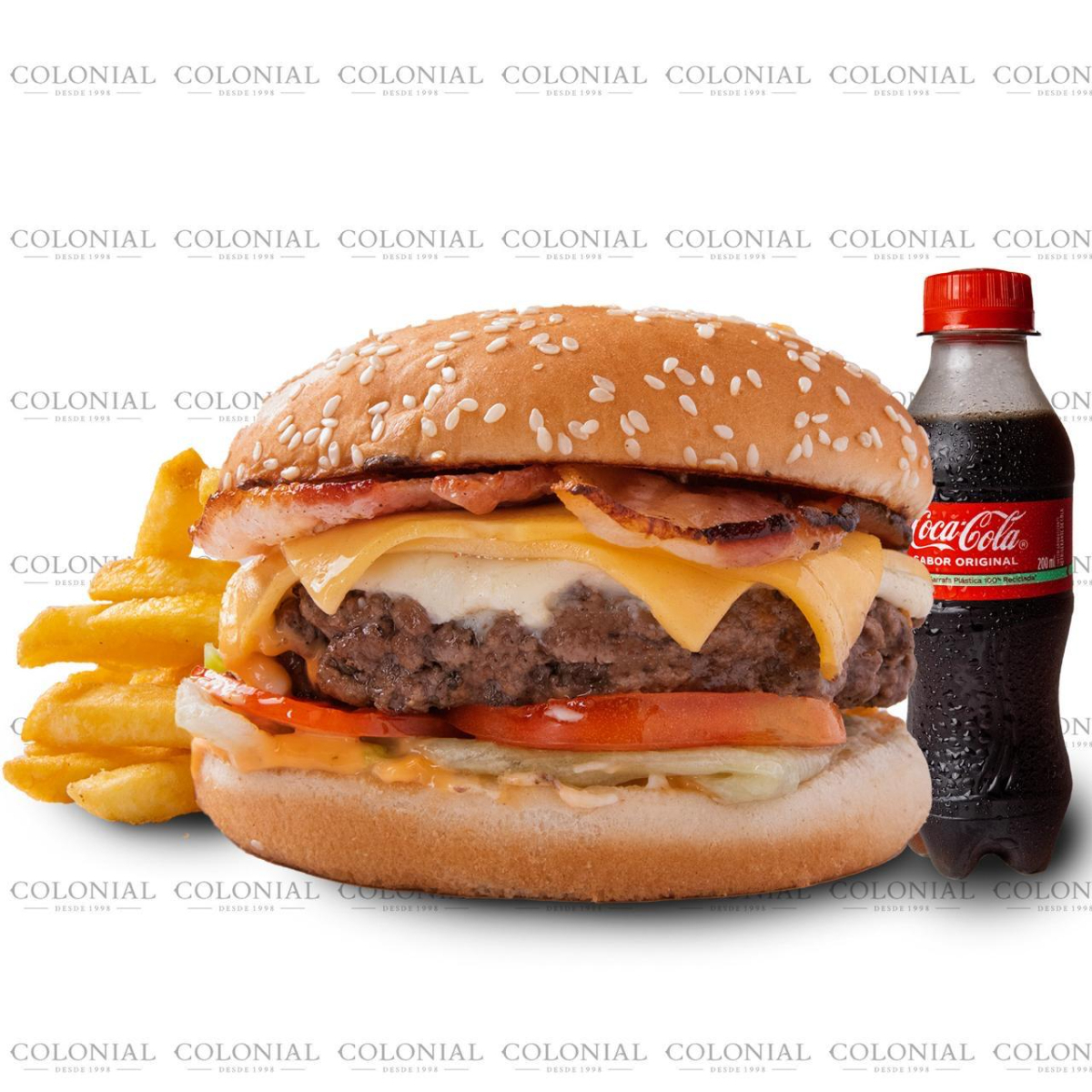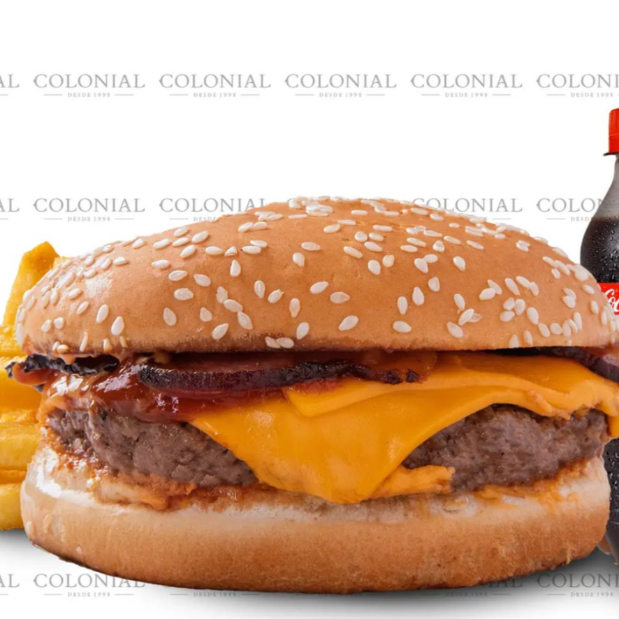 Pão com gergelim, 140 g de Carne Angus, queijo cheddar, ketchup americano, mostarda e bacon. Acompanha batatas e Refrigerante 200ml