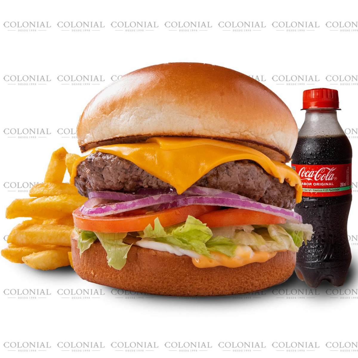 Pão brioche, 140g de angus beef, provolone defumado, cebola roxa, alface americana tomate. Acompanha Batata frita e refrigerante 200ml.