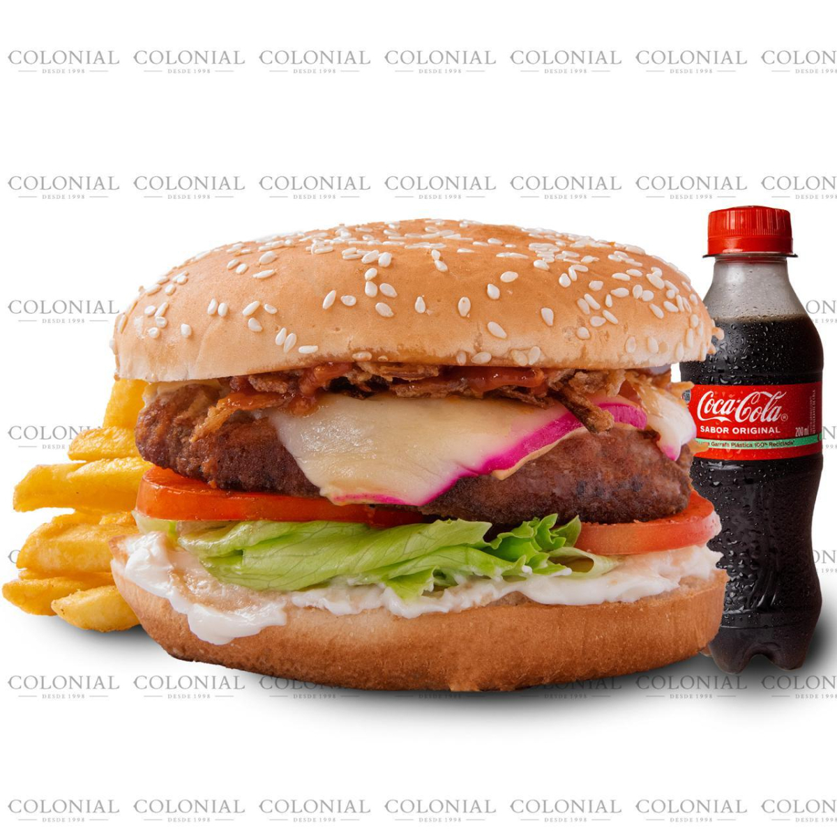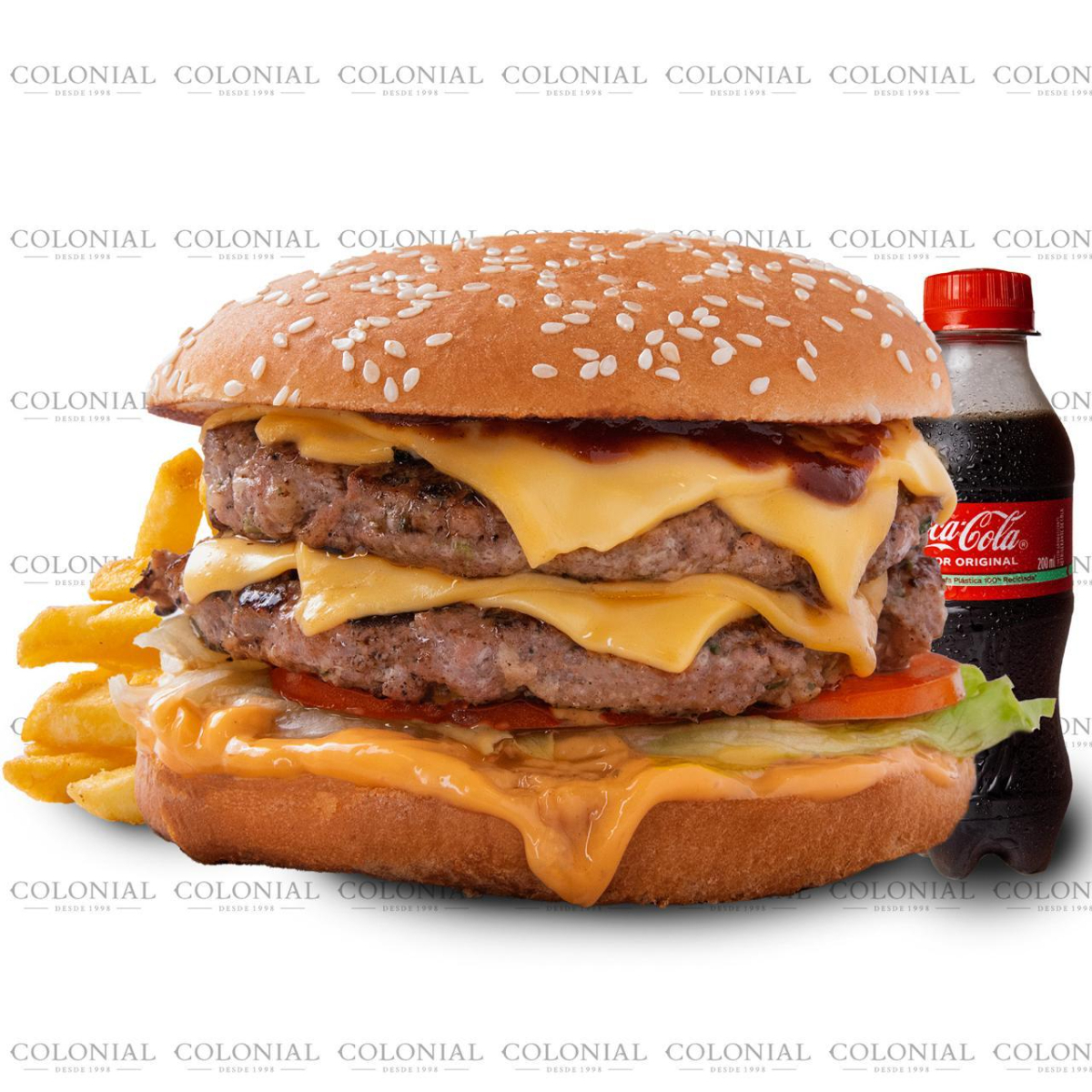 Pão brioche, 140g de angus beef, queijo gouda, queijo prato e onion crispy. Acompanha batata frita e refrigerante 200ml.