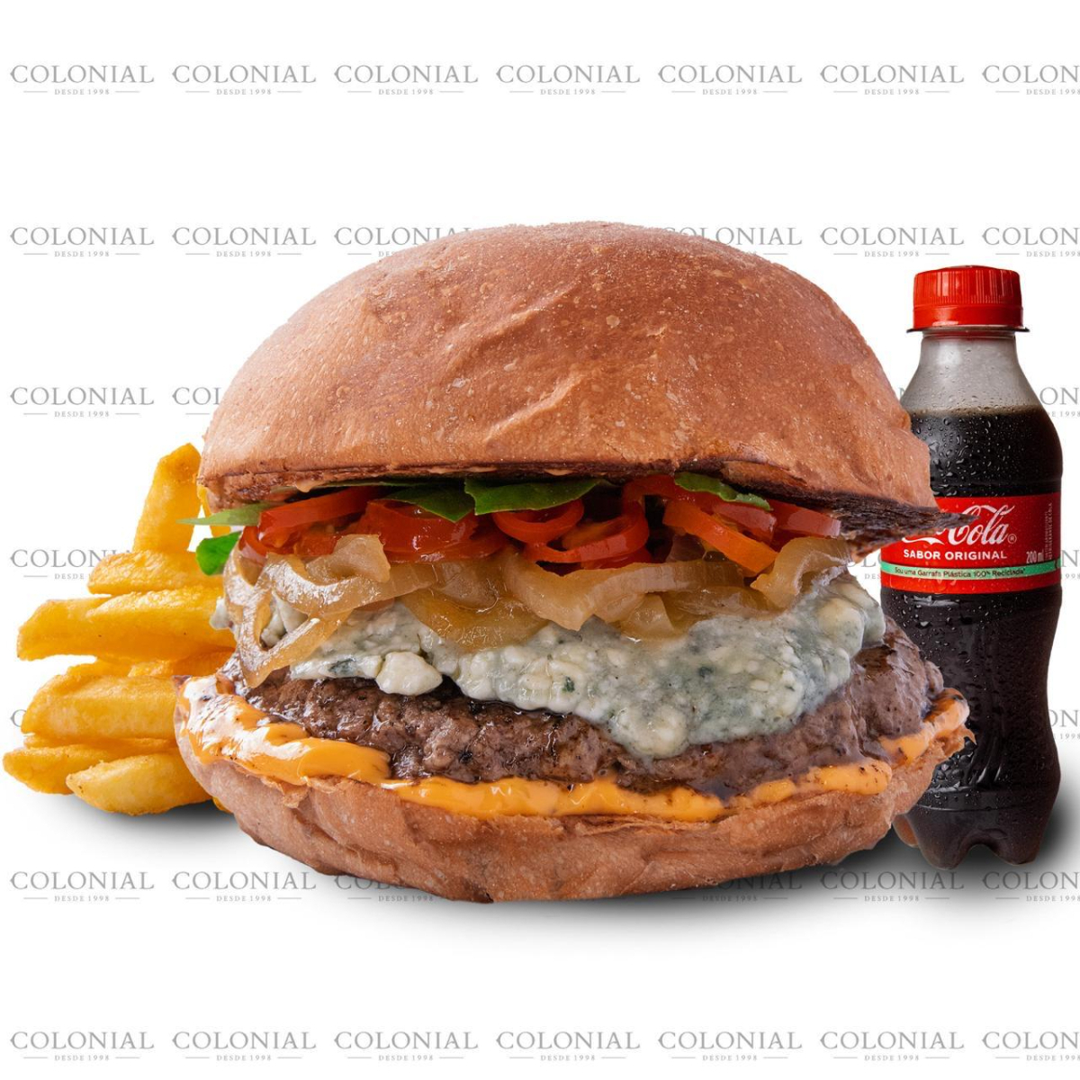 Pão australiano, carne angus, gorgonzola, cebola caramelizada com mel, manjeriçao e tomate sweet grape. Acompanha Batata frita e refrigerante 200ml.