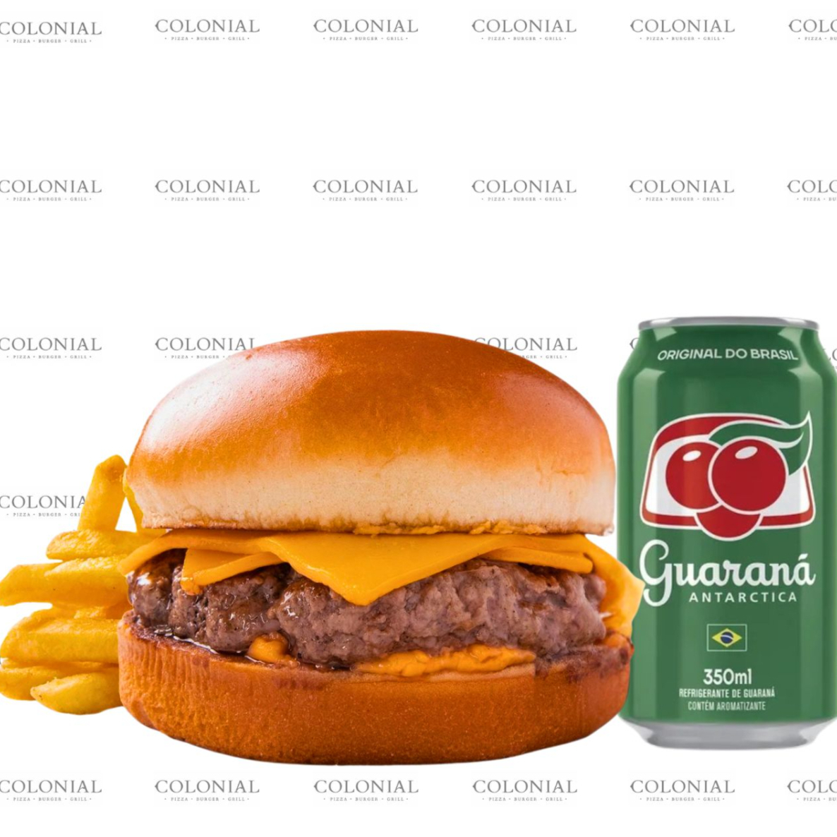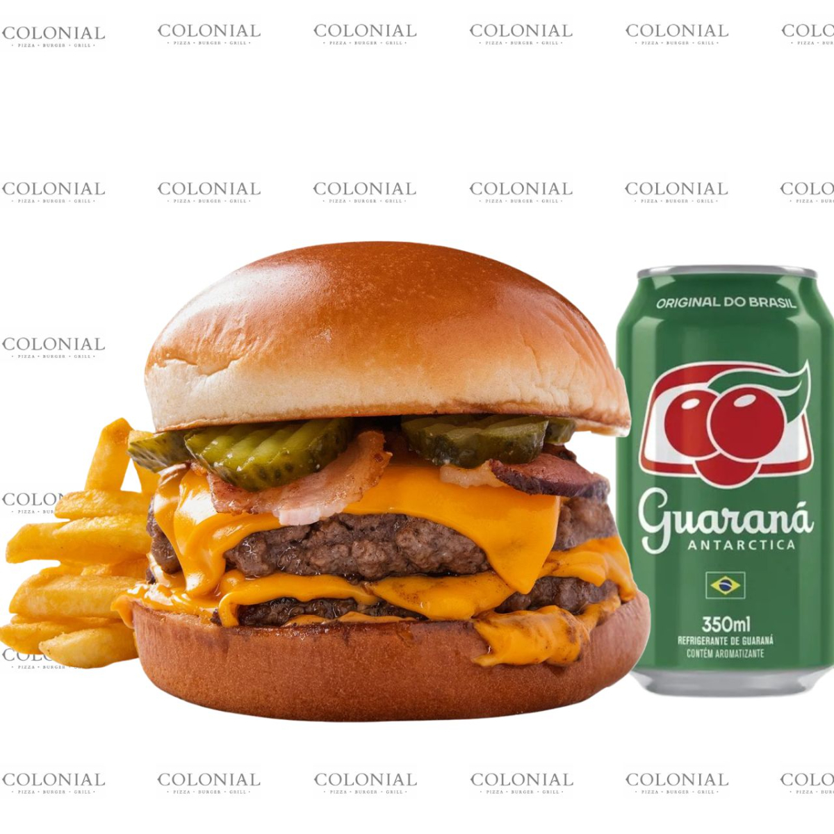 Pão tradicional, 2 burgers de 110g de calabresa, queijo prato, vinagrete e pimenta biquinho. Acompanha Batata frita e refrigerante 200ml.