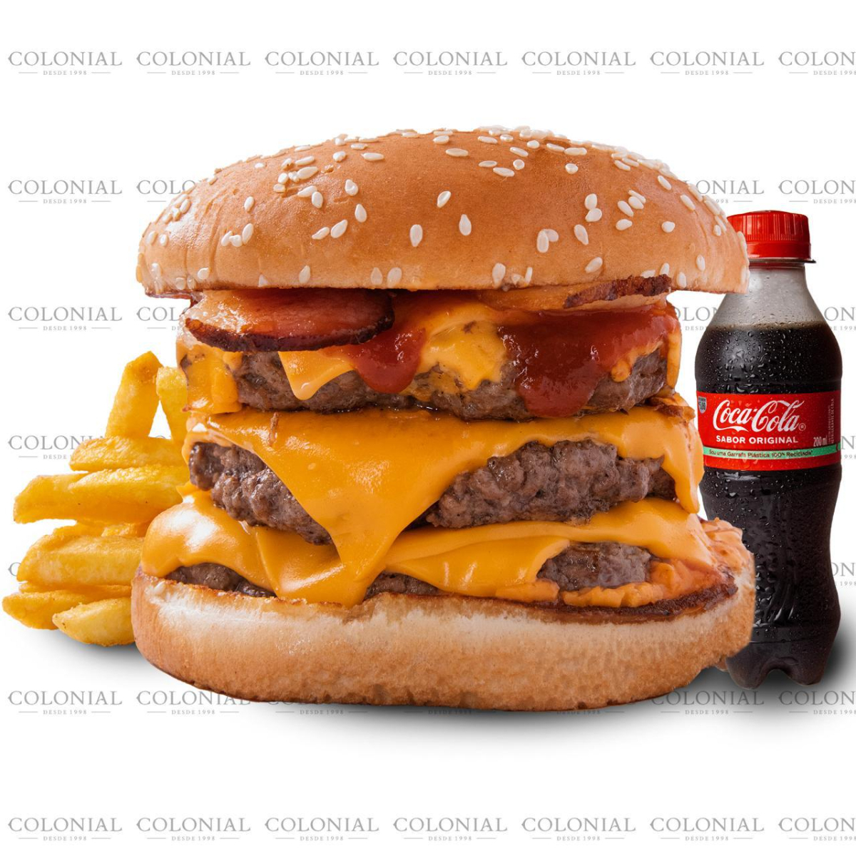 Pão tradicional, 3 burguers angus black, cheddar inglês, bacon e ketchup strumpf. Acompanha Batata frita e refrigerante 200ml.