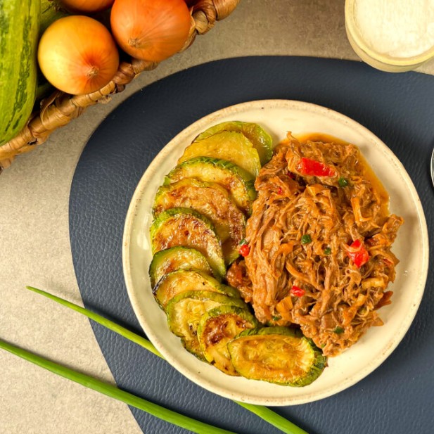 Deliciosa carne louca de lagarto bovino temperada com cebola, pimentões e acompanhada de uma saborosa abobrinha grelhada.