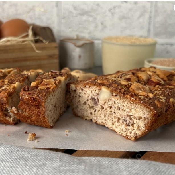 Pão low carb com castanhas fresquinho e fofinho. Cai bem em qualquer hora do dia, seja puro ou com nossa geleia de morango.