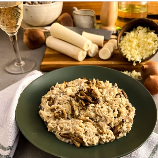 Palmito pupunha cortado em formato de arroz, deliciosamente preparado como risoto acompanhado de funghi seco e queijo parmesão.
