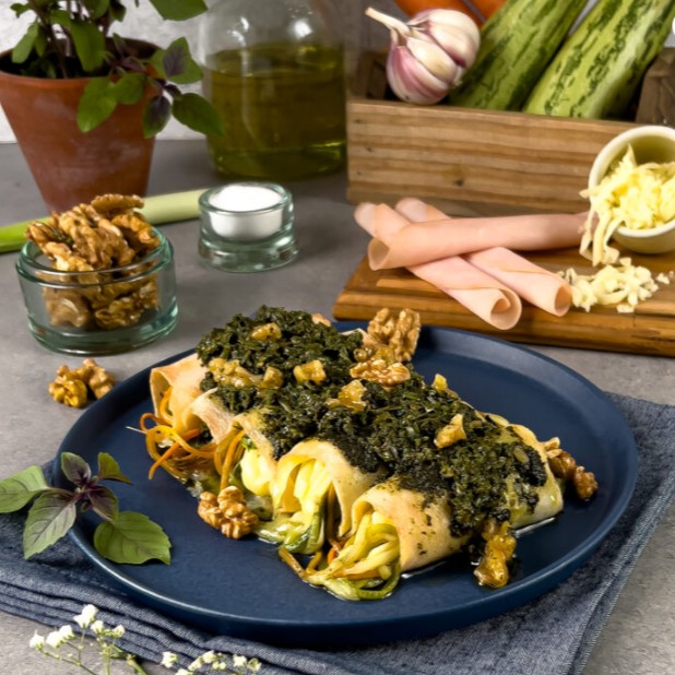 Canelone de peito de peru enrolando espaguetes de cenoura e abobrinha cobertos por um saboroso molho pesto e alho-poró. Uma ideia genial!