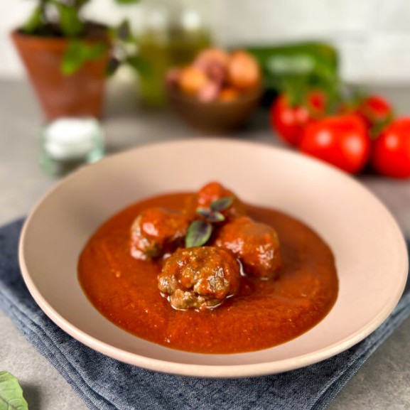 Deliciosas almôndegas artesanais feitas com fraldinha bovina moída, levemente seladas e cozidas no nosso molho de tomate.
