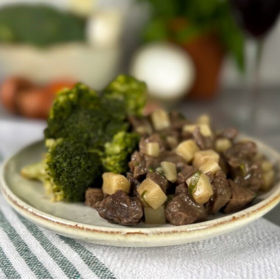 Picadinho de filé mignon cozido com tinto, cebola, alho e palmito acompanhado de uma porção de crocantes brócolis.