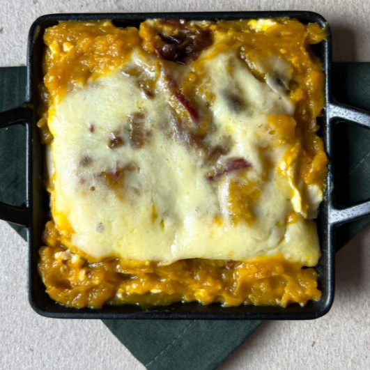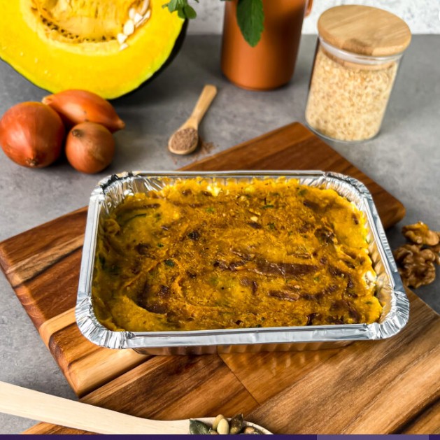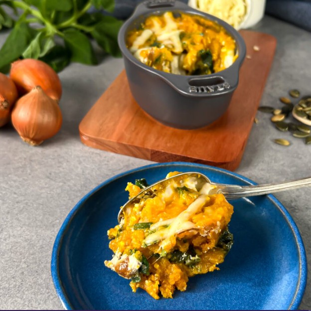 Escondidinho vegetariano com abóbora cabotiá, cebola, espinafre, queijo mussarela e requeijão. Prato gostoso para não colocar defeito.