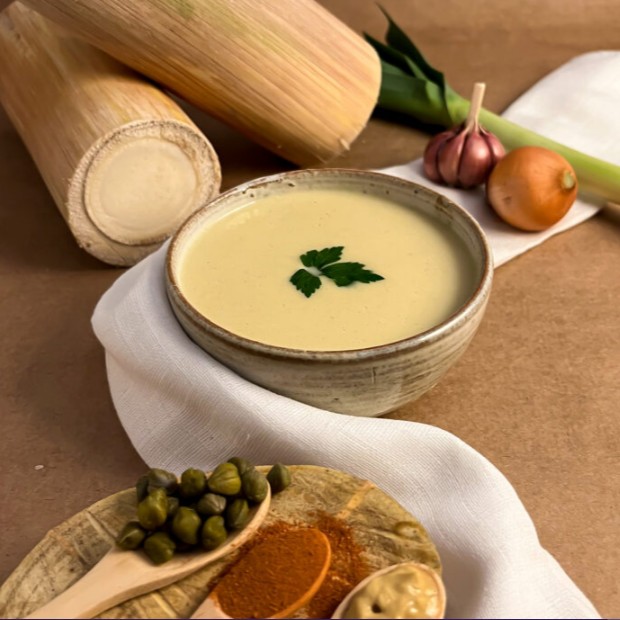 Cremosa sopa de palmito com requeijão acompanhada de mostarda dijon, alcaparra, alho-poró e páprica. Uma explosão de sabor!