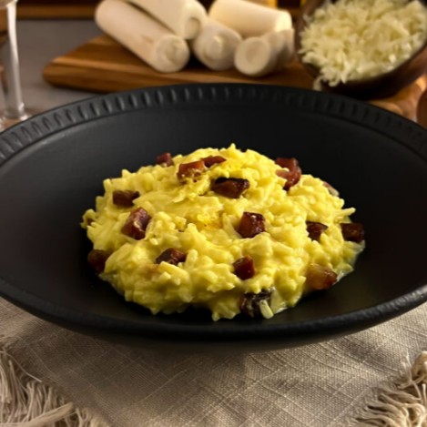 Palmito pupunha cortado em formato de arroz, deliciosamente preparado como risoto acompanhado de açafrão, bacon e queijo parmesão.